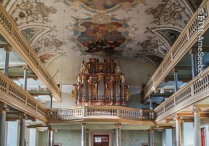 Das erste Gebäude, das Christian Ernst 1686 in Angriff nimmt, ist die Hugenottenkirche, deren Bau genau den Bedürfnissen der Hugenotten entspricht: Das Wort steht klar im Vordergrund, deshalb gibt es im Oval der Kirche kein Kreuz, keine Kerzen und keinen Altar. In den Mittelpunkt rücken Kanzel und Abendmahlstisch.