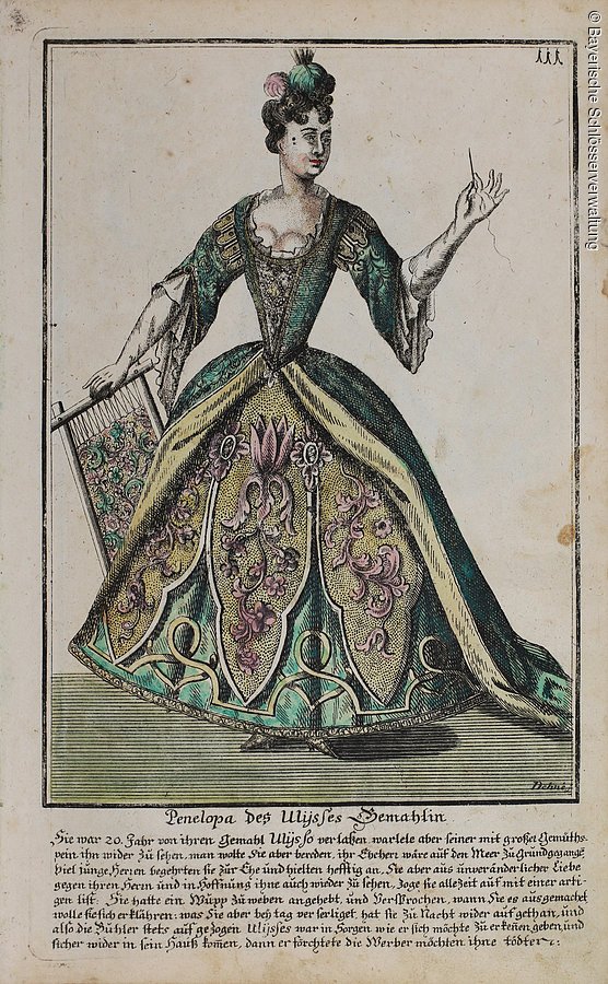 Unter der Vielzahl der abgebildeten mythologischen und allegorischen Bühnenkostüme fiel die Wahl auf das Kleid der Penelope, der Gattin des griechischen Heros Odysseus. Zur Auswahl der passenden Stoffe für das Kleid mit seiner besonders schönen Ornamentik waren umfangreiche Archivstudien notwendig. Fündig wurde man im Staatsarchiv Bamberg. Dort hat sich ein Inventar von 1715/26 über die „auf dem Residenzschloss zu Bayreuth befindlichen Redouten-, Opern-, Comödien- und Masqueradenkleider” erhalten. Darin sind die zum Teil überaus kostbaren Materialien der Kleider genau bezeichnet – für die antiken Frauenkostüme etwa wird häufig Seidendamast, Taft und Samt genannt.