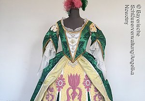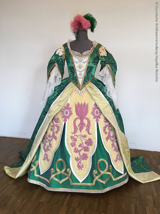 Angefertigt wurde es im Auftrag der Bayerischen Schlösserverwaltung für das neu entstehende Museum zum Markgräflichen Opernhaus in Bayreuth. Die Vorlage für dieses prachtvolle Kleid samt Kopfputz stammt aus Bayreuth selbst: Es ist eine graphische Darstellung aus dem Kostümbuch des Bayreuthers Rüstkämmerers Johann Meßelreuther. In seiner Stichsammlung, die 1723 unter dem Titel „Neu eröffneter Masquen-Saal” erschien, sind mehr als 200 „Masqueraden-Figuren” abgebildet: Sie vermitteln einen anschaulichen Eindruck vom Kostümfundus der Bayreuther Oper unter Markgraf Georg Wilhelm zu Beginn des 18. Jahrhunderts.