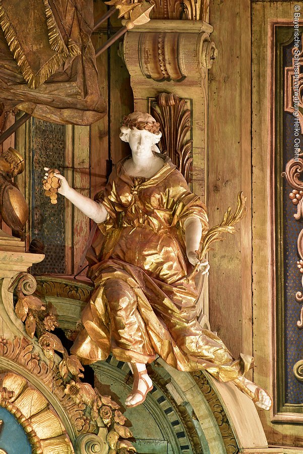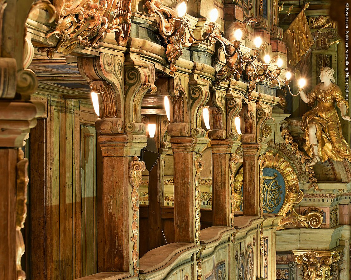 Bei der Auswahl und Verarbeitung wurden die Textilrestauratoren der Bayerischen Schlösserverwaltung von der renommierten Kostümbildnerin Angelika Nowotny unterstützt. In ihrer Werkstatt wurde der graphische Entwurf auch umgesetzt.