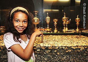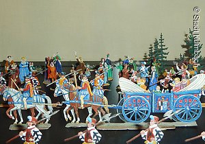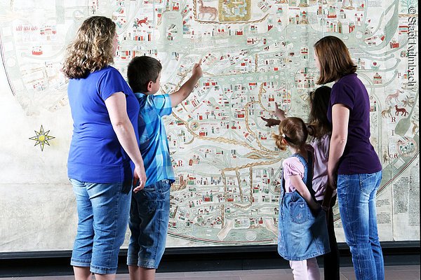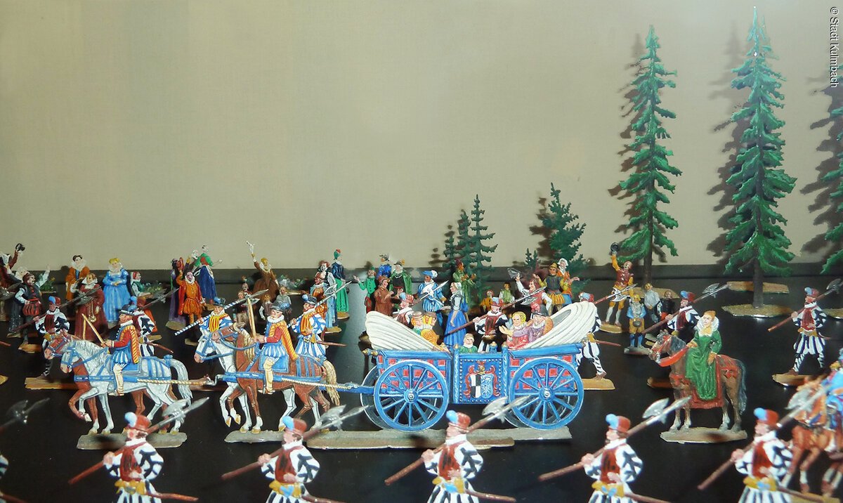 In der Ausstellung werden die Entwicklung der Stadt Kulmbach und natürlich vor allem die Herrschaftsgeschichte unter den fränkischen Hohenzollern aufgezeigt – direkter Blickkontakt mit dem Markgrafen ist also garantiert. Besonders bedeutend für die Geschichte der Plassenburg ist Markgraf Georg Friedrich, der sie nach ihrer Zerstörung wieder aufbauen ließ. Der Heimholung seiner Braut Sophie von Braunschweig-Lüneburg auf die Plassenburg, die mit einem rauschenden Fest gefeiert wurde, ist ein exquisites Zinnfigurendiorama gewidmet.