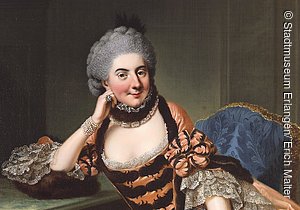 1764 bezieht Markgräfin Sophie Caroline Marie das Erlanger Schloss als Witwenresidenz. Hier lebt sie mit ihrem rund 40 Personen umfassenden Hofstaat fast 50 Jahre lang. Sie empfängt zahlreiche Gäste im Schloss, darunter zweimal König Friedrich Wilhelm von Preußen. Im Schloss trifft sich die Erlanger Gesellschaft: allen voran die Professoren, die Sophie ihre neuesten wissenschaftlichen Erkenntnisse vortragen und sogar Experimente vorführen müssen. Auch die adeligen Studenten zählen zum ständigen Besucherkreis ihrer Hoftafel.