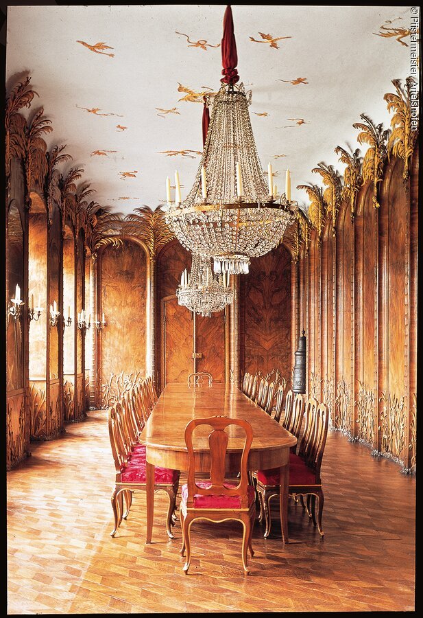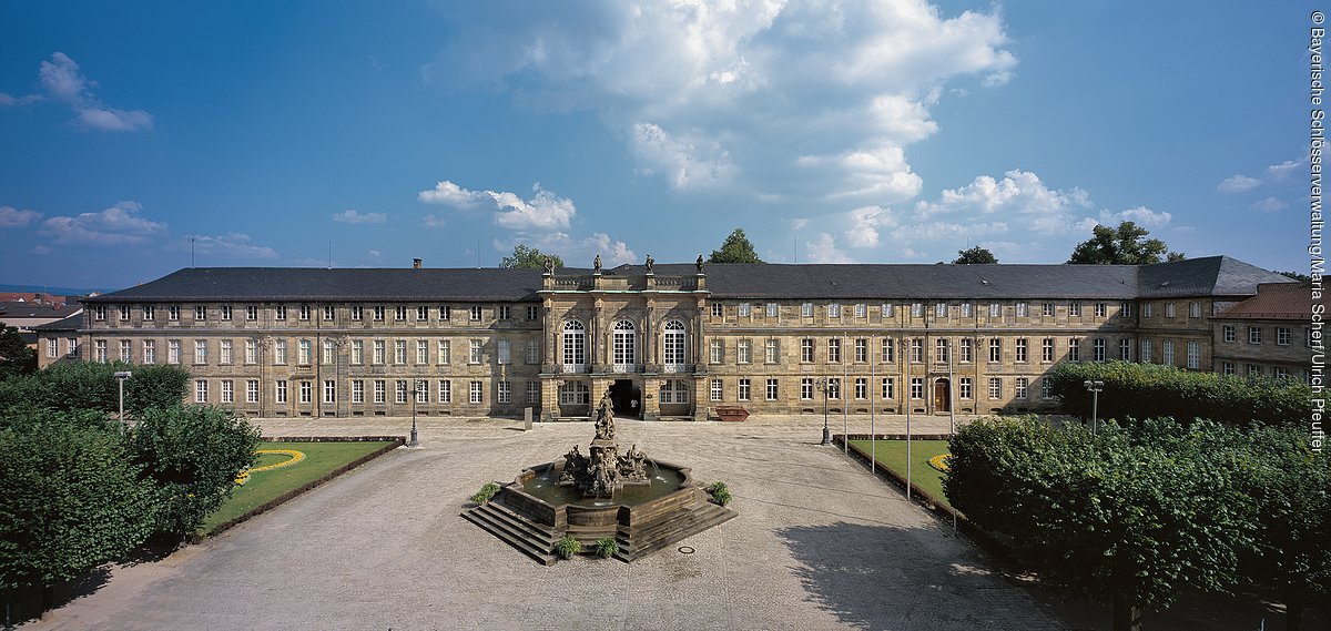 Mit dem Festsaal, welcher mit feinstem Goldstuck und hoheitlicher Pilastergliederung ausgestattet ist, oder dem Palmenzimmer zählt das Neue Schloss zu den Hauptwerken der deutschen Architektur des 18. Jahrhunderts: Es ist ein Höhepunkt des Bayreuther Rokokos.
