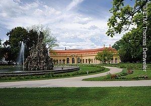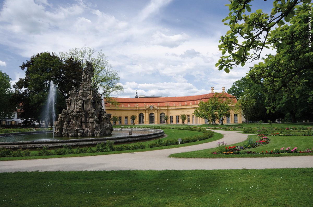Der 7,5 Hektar große Erlanger Schlossgarten gilt als eine der frühesten barocken Gartenanlagen Frankens. Hauptattraktion des Parks ist der 1706 von Elias Räntz entworfene Hugenottenbrunnen. Auf seiner untersten Ebene sind Mitglieder vornehmer Hugenottenfamilien dargestellt, in der Mitte antike Gottheiten und ganz oben Markgraf Christian Ernst. Er ist es, der die Erlanger Neustadt für die aus Frankreich geflohenen Hugenotten erbauen lässt.
