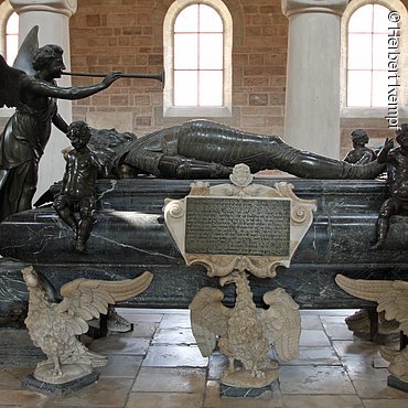 Markgraf Joachim Ernst stirbt 1625. Er ist der letzte Hohenzollernfürst, der in der Hohenzollerngrablege im Heilsbronner Münster bestattet wird.
