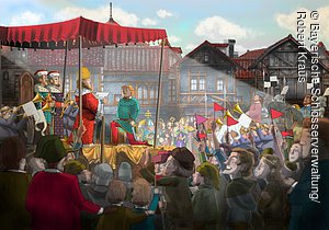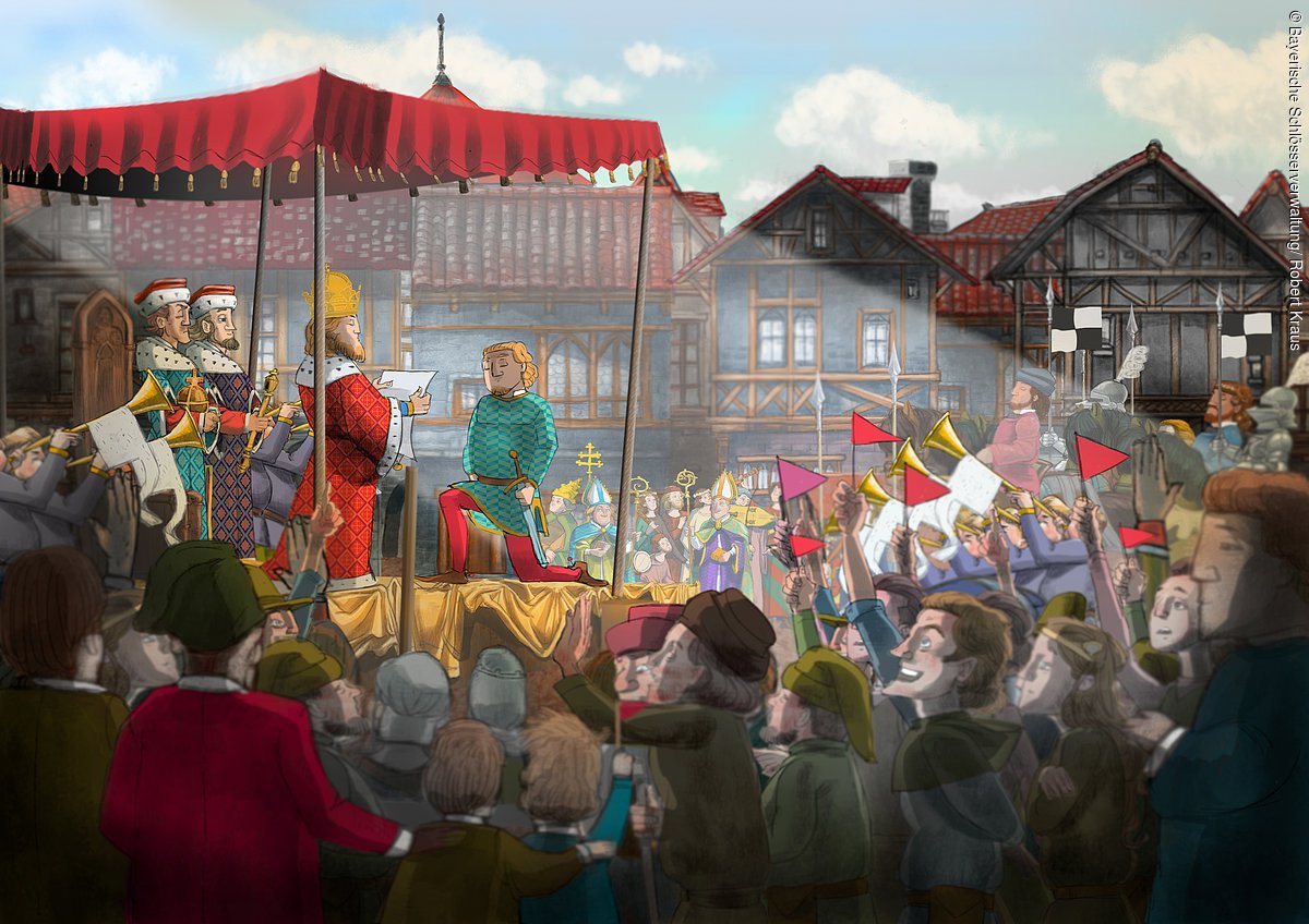 Friedrich kniet nieder, als König Sigismund die offizielle Belehnungsurkunde verliest. Die Kurfürsten-Kollegen übergeben Friedrich einen Reichsapfel und ein Zepter als Zeichen seiner neuen Macht. Natürlich wird das Ganze von festlichen Tafeleien begleitet – und von Chronisten festgehalten.